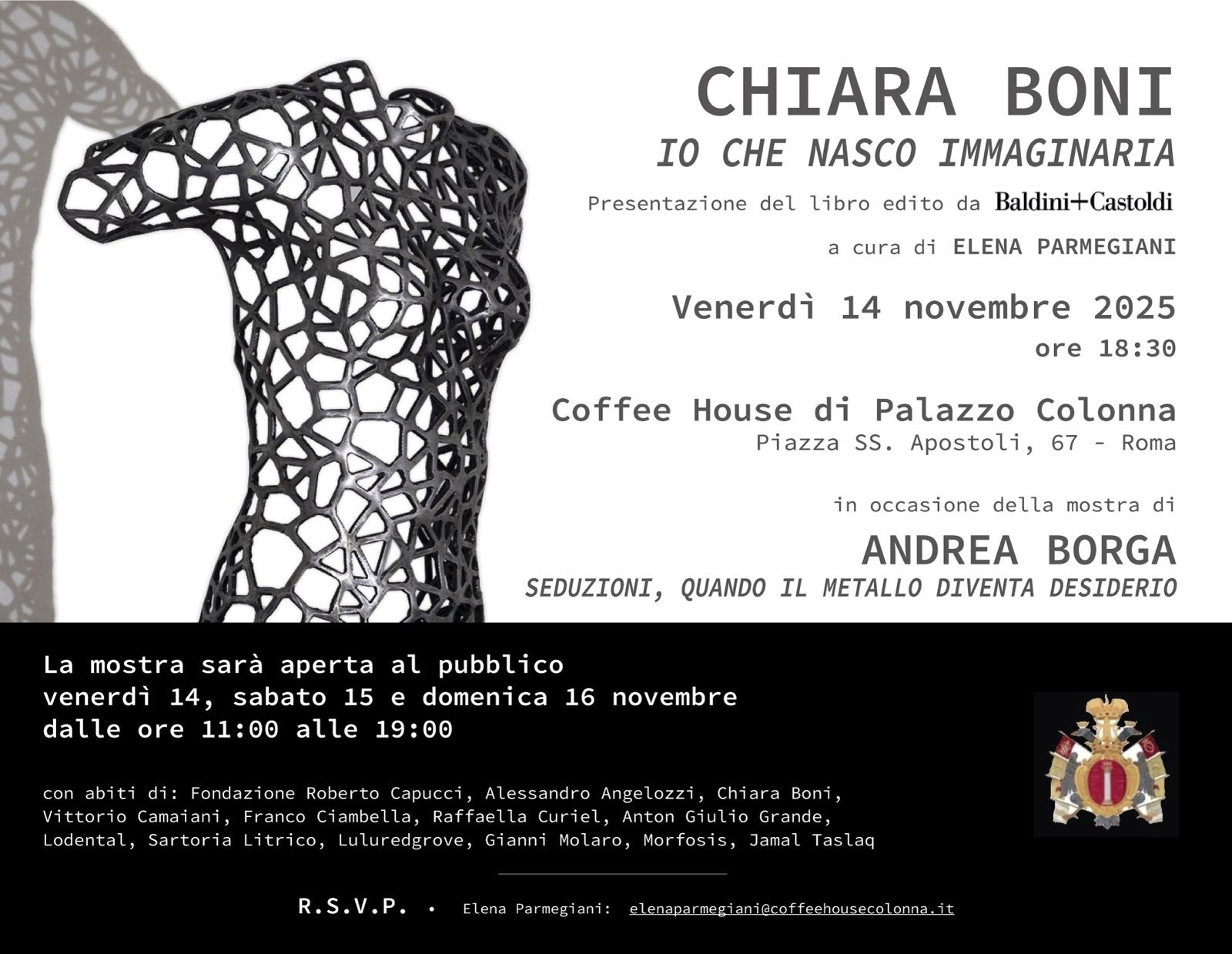 In occasione della mostra Seduzioni, quando il metallo diventa desiderio dello scultore triestino Andrea Borga, ospitata alla Coffee House di Palazzo Colonna a Roma, la stilista Chiara Boni presenterà il suo volume “Io che nasco immaginaria”venerdì 14 novembre alle ore 18,30.