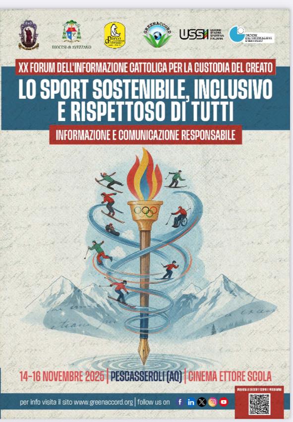 PESCASSEROLI (AQ) – Nella suggestiva cornice del cinema di Pescasseroli, intitolato allo sceneggiatore, regista e produttore cinematografico italiano tra più apprezzati, Ettore Scola, protagonista della grande stagione della commedia all’italianasi è svolta la XX edizione del Forum dell’Informazione cattolica per la custodia del Creato, dal titolo “Lo sport sostenibile, inclusivo e rispettoso di tutti. Informazione e comunicazione responsabile”. Una tre giorni organizzata da Greenaccord, Associazione Culturale di ispirazione cristiana e senza fini di lucro, nata per stimolare l’impegno di tutti gli uomini e le donne di qualsiasi credo e confessione religiosa, sul tema della salvaguardia della natura.