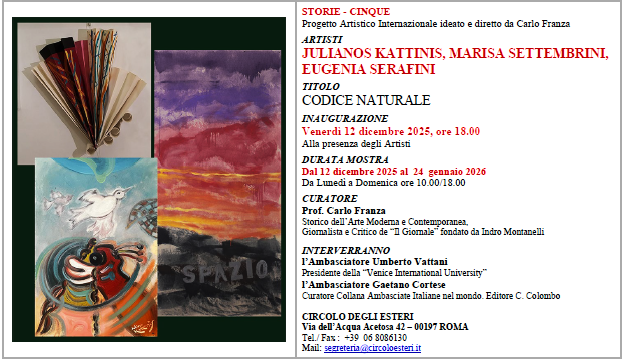 Nell’ambito del progetto “Storie” ideato e curato da Carlo Franza  al via la mostra dal titolo “Codice naturale ” Con le opere di Julianos Kattinis, Marisa Settembrini, Eugenia Serafini.  In esposizione fino al 24 gennaio 2026