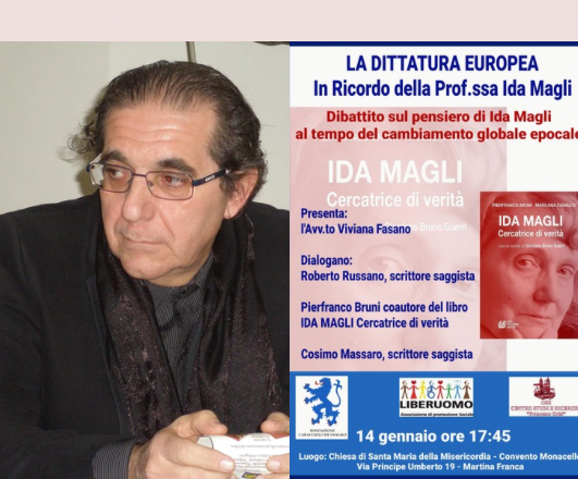 Un confronto sul pensiero critico e profetico di Ida Magli, intellettuale libera e controversa, capace di leggere con lucidità le trasformazioni dell’Europa e dell’Occidente: è questo il cuore dell’incontro “La dittatura europea. In ricordo della Prof.ssa Ida Magli”, in programma il 14 gennaio alle ore 17:45 a Martina Franca, presso la Chiesa di Santa Maria della Misericordia – Convento Monacelle.