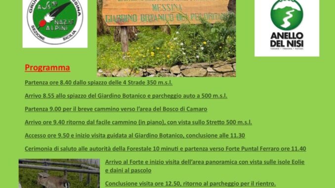 Sabato 16 maggio 2026, raduno alle ore 8.30 a Colli San Rizzo (4 Strade). In programma visita al Giardino Botanico, percorso naturalistico con vista sullo Stretto e tappa al Forte Puntal Ferraro con panorama sulle Eolie